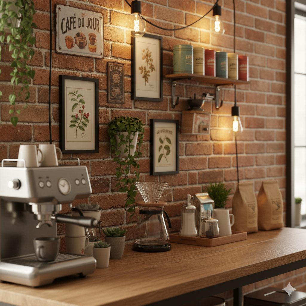 - Tazas colgadas en ganchos visibles, dándole un aire de cafetería auténtica.