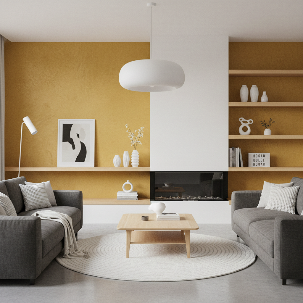 Ejemplo en casa: En un salón, una pared en color amarillo mostaza acompañada de muebles grises y detalles en madera clara transmite alegría sin excesos.